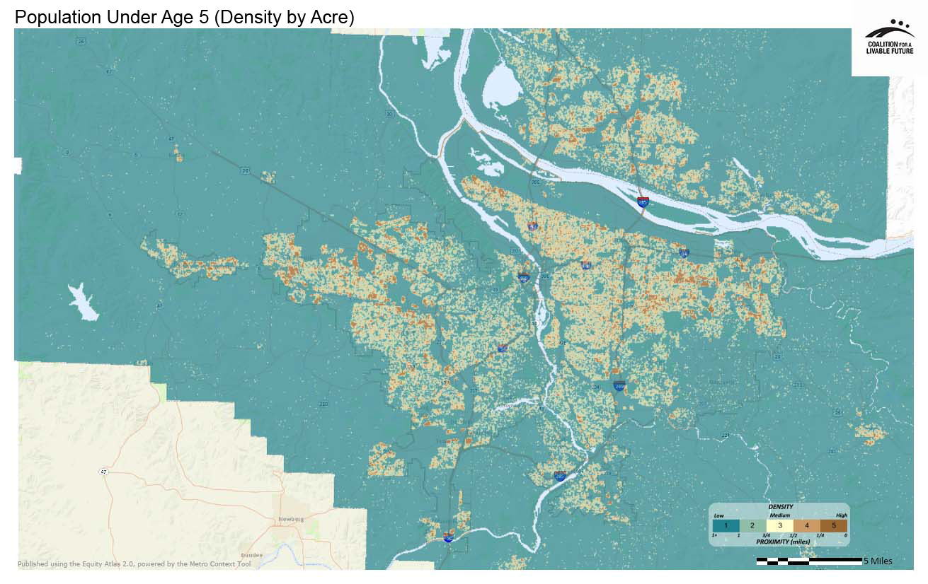 The map below shows the densities of children under the age of five. It measures densities on a 1 to 5 scale, with 1 representing the areas with the lowest densities of children under age five per acre and 5 representing the areas with the highest densities of children under age five per acre. The areas with the lowest densities are shown in aqua, and the areas with the highest densities are shown in brown.