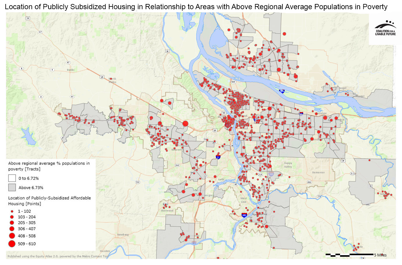 The map below is a Shape map that shows the locations of publicly subsidized affordable housing units (the larger the red dot, the larger the number of units at each location) in relationship to census tracts with above the regional average percent of populations in poverty.