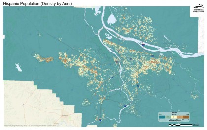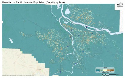 This also means that we cannot meaningfully compare the data in this map with the data in another density map because the scales for the scoring systems in the two maps may be different. For example, although the brown areas in the maps below show the places with the highest densities per acre of Hispanics and Hawaiian/ Pacific Islanders, the actual numeric values represented by the brown areas in each map are different. Because the overall numbers of Hawaiian/ Pacific Islanders in the Portland-Vancouver metro region are much smaller than the overall numbers of Hispanics in the region, the numbers of Hawaiian/ Pacific Islanders in the places with the highest densities of Hawaiian/ Pacific Islanders will be much smaller than the numbers of Hispanics in the places with the highest densities of Hispanics.